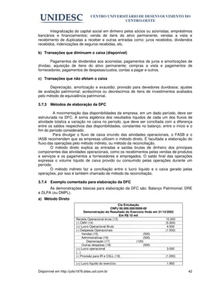 O documento descreve os conceitos e métodos de elaboração da Demonstração do Fluxo de Caixa (DFC), incluindo: 1) A DFC indica as entradas e saídas de caixa durante um período; 2) As movimentações são classificadas em fluxos de caixa de atividades operacionais, de financiamento e de investimento; 3) São apresentados exemplos de transações que afetam o caixa e métodos para elaboração da DFC, como o direto e o indireto.