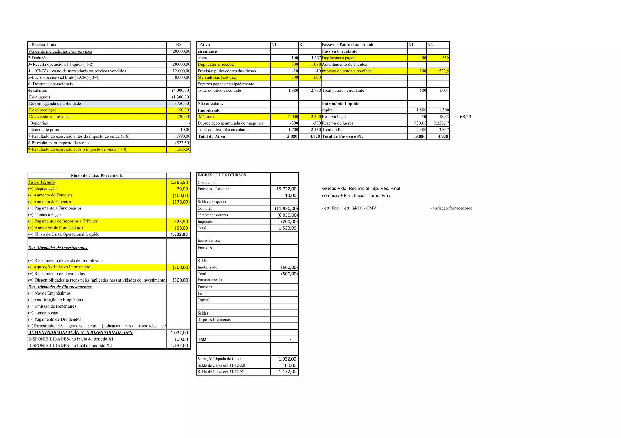 2) A empresa teve receita bruta de R$20.000,00, lucro operacional bruto de R$8.000,00 e resultado líquido após impostos de R$1.366,50.