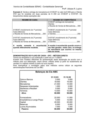 1) O documento discute os princípios contábeis de regime de caixa e regime de competência, apresentando exemplos para ilustrar a diferença nos lançamentos contábeis de acordo com cada regime.