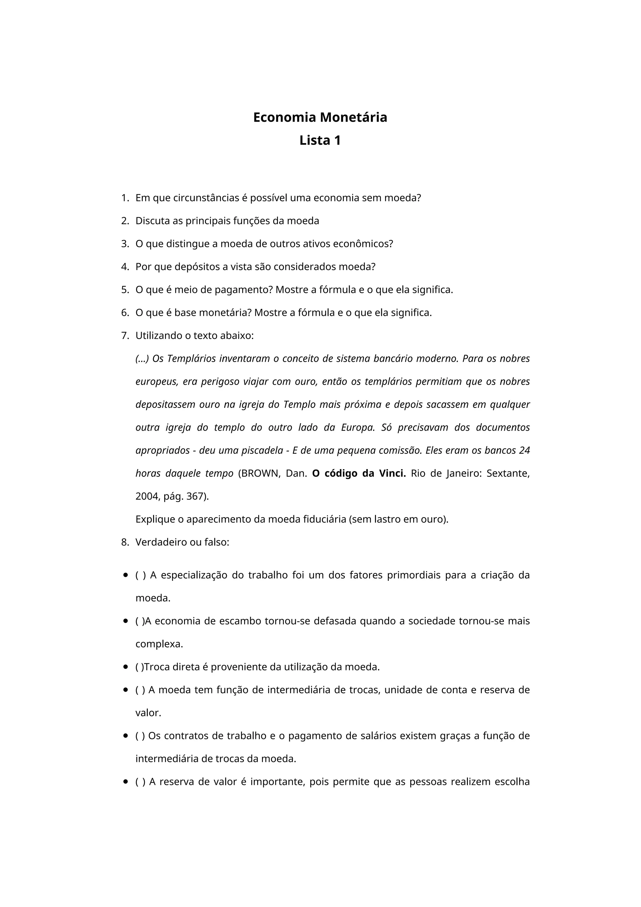 2. Apresenta questões sobre as funções da moeda, origem da moeda fiduciária e verdadeiro ou falso sobre afirmações relacionadas a economia monetária.