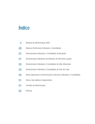 O relatório discute o desempenho da Embraer em 2008, incluindo entregas de 204 jatos, crescimento de receita de 17,5%, e lucro líquido de R$428,8 milhões. A Embraer também implementou melhorias operacionais através do Programa de Excelência Empresarial e apoiou projetos sociais. No entanto, devido à crise financeira global, a Embraer viu uma queda nas vendas no quarto trimestre e reduziu seu quadro de funcionários em cerca de 20%.