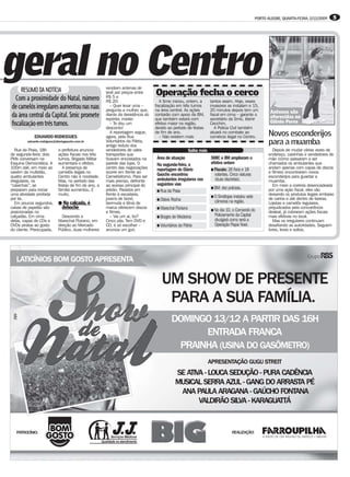 O documento descreve o aumento do número de camelôs irregulares nas ruas do centro de Porto Alegre com a proximidade do Natal, apesar das promessas da prefeitura de realizar fiscalizações em três turnos com apoio da Brigada Militar. Também relata as táticas dos camelôs para esconder mercadorias ilegais quando surpreendidos pela fiscalização e a continuidade do comércio irregular em desafio às autoridades.