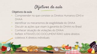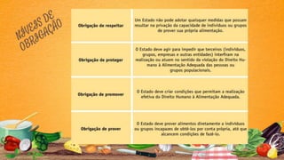 O documento discute o direito humano à alimentação adequada, definindo-o e apresentando os marcos legais internacionais e nacionais que o protegem. Também aborda as dimensões e violações deste direito, como a fome, a má-nutrição e o desperdício de alimentos.