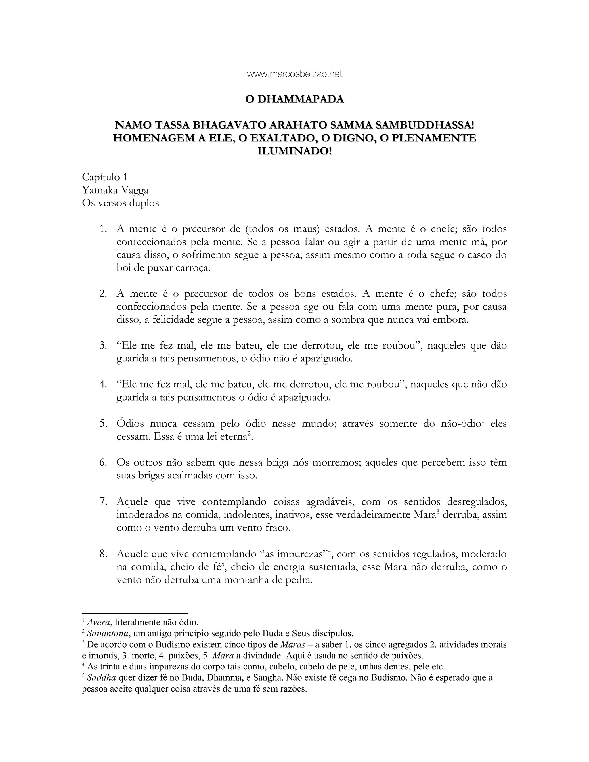 Este documento apresenta o capítulo inicial do Dhammapada, um texto budista clássico. O capítulo discute a importância da mente, como a mente pura leva à felicidade enquanto a mente impura causa sofrimento. Ele também discute a necessidade de vigilância contra o descuido e a indulgência nos prazeres sensuais. A mente é descrita como difícil de controlar, mas aqueles que a dominam alcançam a libertação.