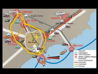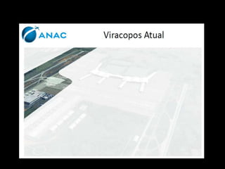 O documento fornece informações sobre a infraestrutura aeroportuária brasileira e o Aeroporto Internacional de Viracopos em Campinas, incluindo seu ranking no transporte de carga, as obras planejadas e sua capacidade atual e projetada.