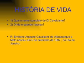 Di Cavalcanti era um pintor brasileiro nascido no Rio de Janeiro em 1897. Ele começou sua carreira artística como desenhista e foi influenciado por estilos como o cubismo. Di Cavalcanti teve um papel importante na Semana de Arte Moderna de 1922 no Brasil e pintava retratos de amigos como Mário de Andrade e modelos como Zuíla. Ele também criou imagens para tapetes no Palácio da Alvorada a pedido de Oscar Niemeyer.