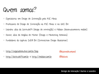 O documento resume um programa de treinamento em Design de Interação ministrado por Karine Drumond e Leandro Alves. O programa aborda tópicos como o que é design, origem e princípios do Design de Interação, relação com marketing, técnicas de pesquisa, prototipação e avaliação. Além disso, recomenda leituras sobre o tema e fornece referências online.