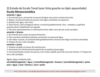 O documento fornece instruções para realizar exercícios sobre cores, incluindo desenhar uma roda de cores, fazer escalas tonais de cores primárias misturadas com água, branco e preto, e combinações de cores secundárias e terciárias.