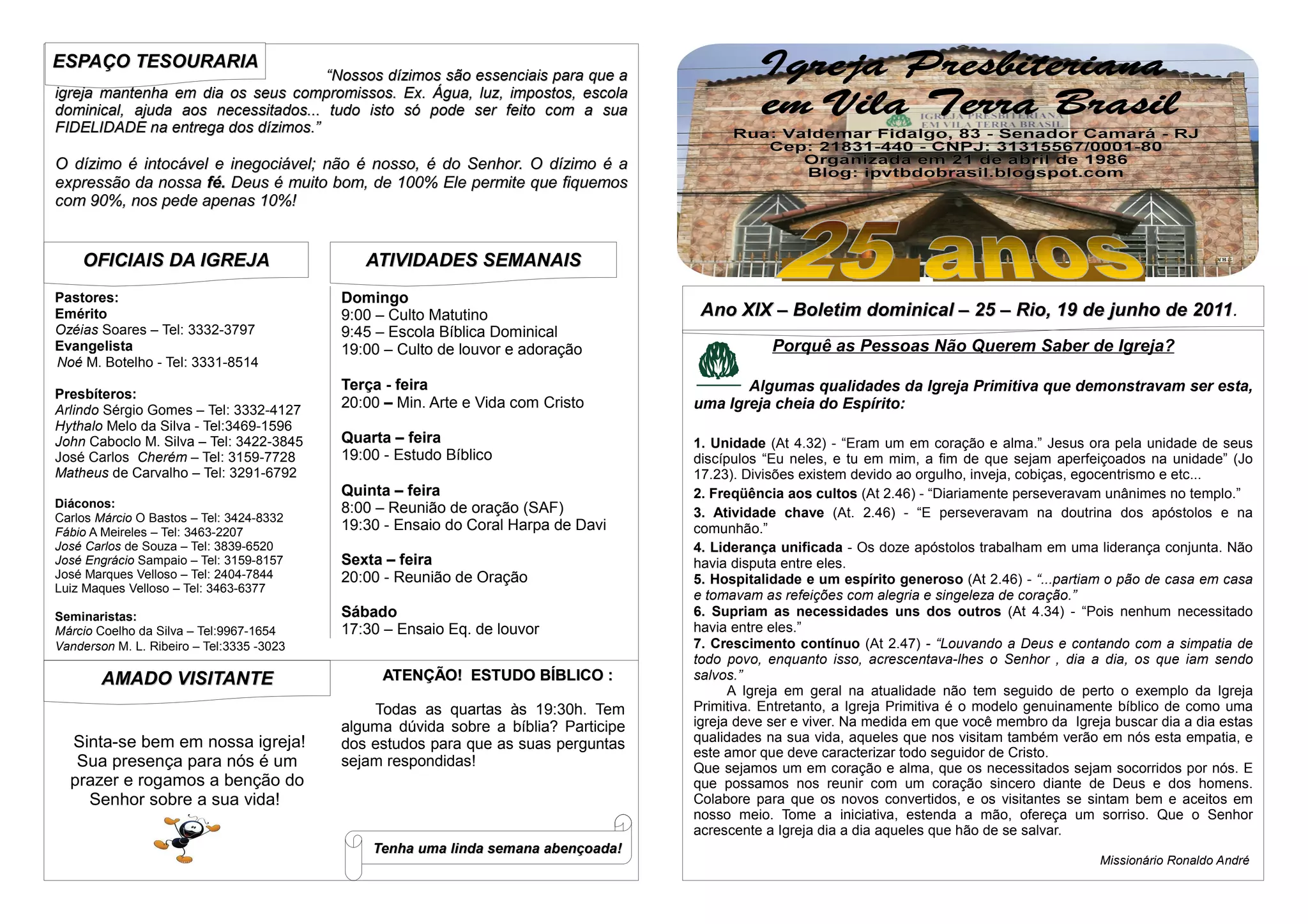 O documento discute a importância dos dízimos para manter as atividades e compromissos da igreja, como água, luz, impostos e ajuda aos necessitados. Também descreve as atividades semanais da igreja, incluindo cultos, estudos bíblicos e reuniões de oração. Finalmente, reflete sobre qualidades da Igreja Primitiva que atraíam as pessoas.