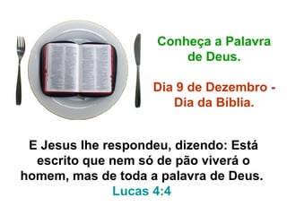E Jesus lherespondeu, dizendo: Está escrito que nem só de pão viverá o homem, mas de toda a palavra de Deus. Lucas 4:4 Conheça a Palavra de Deus. Dia 9 de Dezembro - Dia da Bíblia.