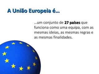 1) A União Europeia é composta por 27 países que trabalham juntos com as mesmas regras e objetivos.