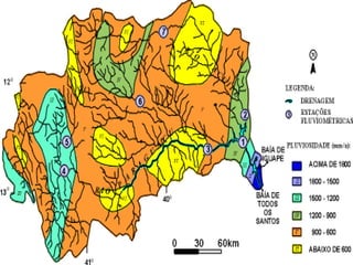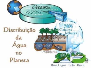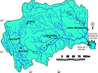 O documento discute vários tópicos relacionados à água, incluindo sua composição química, o ciclo da água, sua importância no corpo humano, doenças relacionadas à água contaminada, conservação e preservação da água. Também aborda o Rio Paraguaçu, seu clima semiárido e variações de precipitação em sua bacia hidrográfica.