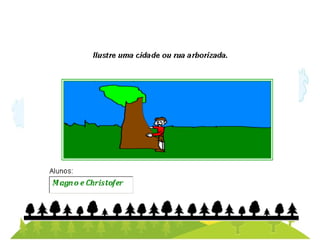 O documento discute a importância das árvores, o Dia da Árvore comemorado em 21 de setembro, e várias espécies de árvores brasileiras como a aroeira, bambu, cedro, cerejeira, coqueiro, imbuia, ipê, jacarandá, jatobá, mogno, pau-brasil e seringueira.