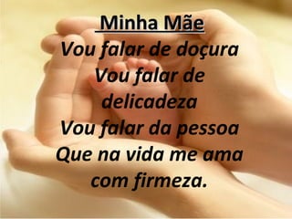 O poema descreve a mãe como uma pessoa delicada e forte que ama incondicionalmente. A mãe é a pessoa mais importante na vida do autor e é a razão de sua felicidade. Ele promete cuidar da mãe para sempre em agradecimento por todo o amor recebido.