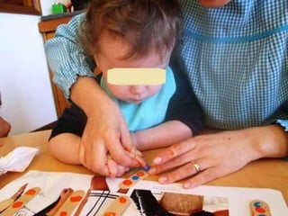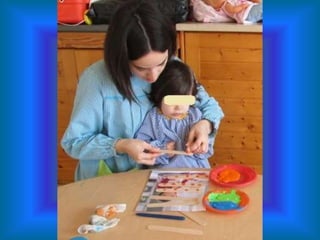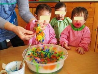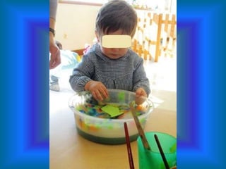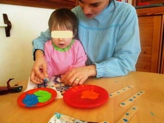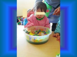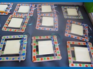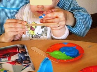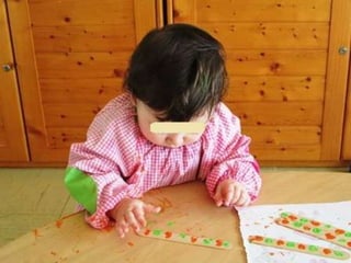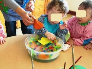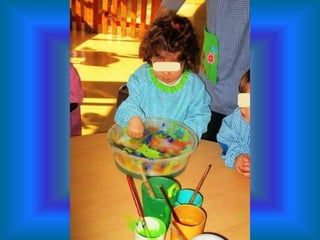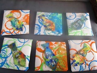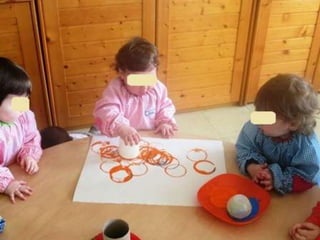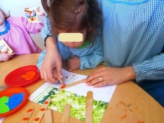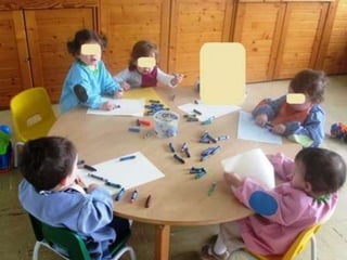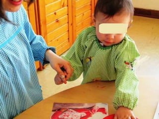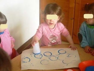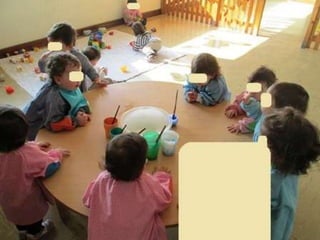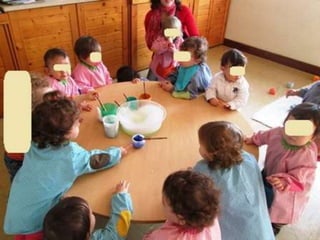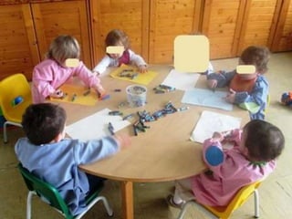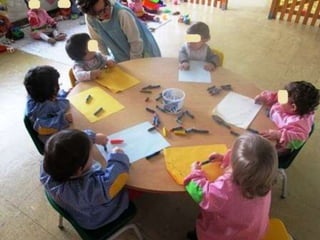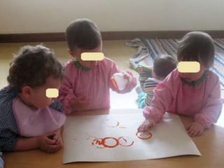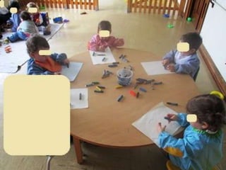 O documento descreve as atividades de um dia na escola infantil, incluindo desenhar com o pai, carimbar com copos, fazer um postal usando técnica de espuma, pintar os dedos e fazer um suporte de bloco de notas. Também menciona a chegada de uma nova criança chamada Francisco.