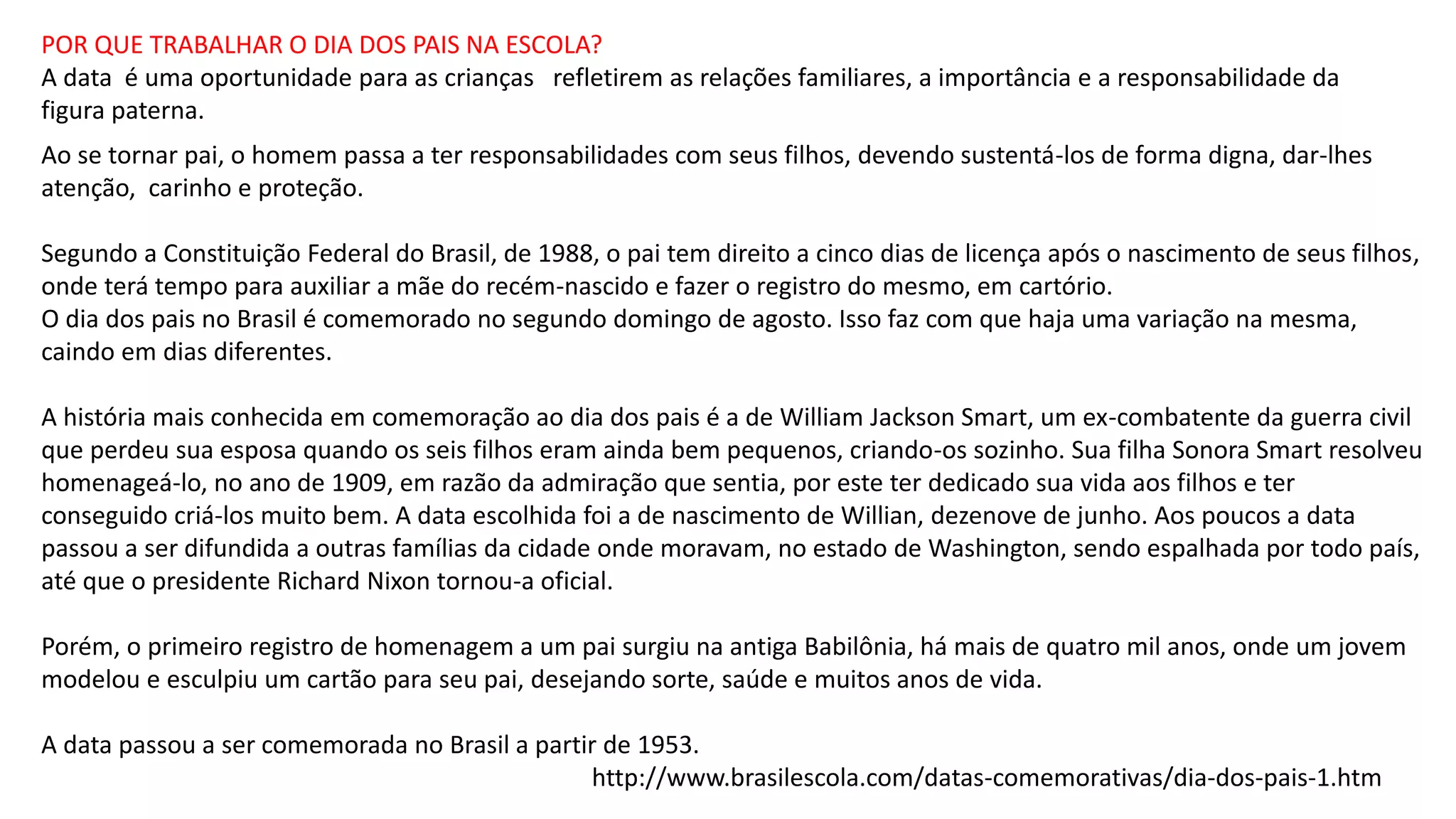 O documento discute a importância de se comemorar o Dia dos Pais na escola para que as crianças reflitam sobre as relações familiares e o papel do pai. Também menciona alguns equívocos a serem evitados, como ignorar diferentes tipos de família ou expor intimidades dos alunos. Por fim, destaca que heróis podem ser aqueles que cuidam da casa e da família no dia a dia.