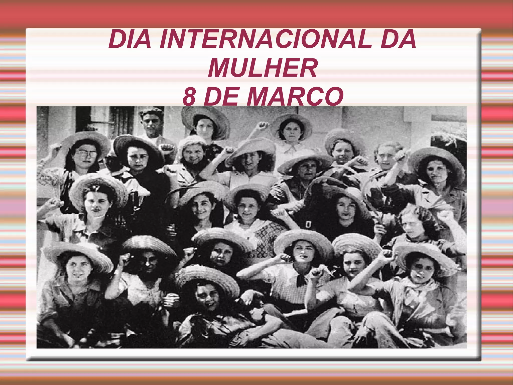 Este documento descreve a origem do Dia Internacional da Mulher e a evolução histórica da situação e dos direitos das mulheres em Portugal.