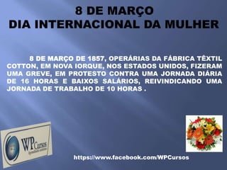 O documento discute o Dia Internacional da Mulher, comemorado em 8 de março. Ele descreve como a data surgiu após uma greve de operárias nos EUA em 1857 e foi oficializada em 1910. Também aborda a luta histórica das mulheres por direitos e sua maior participação no mercado de trabalho ao longo do tempo no Brasil.