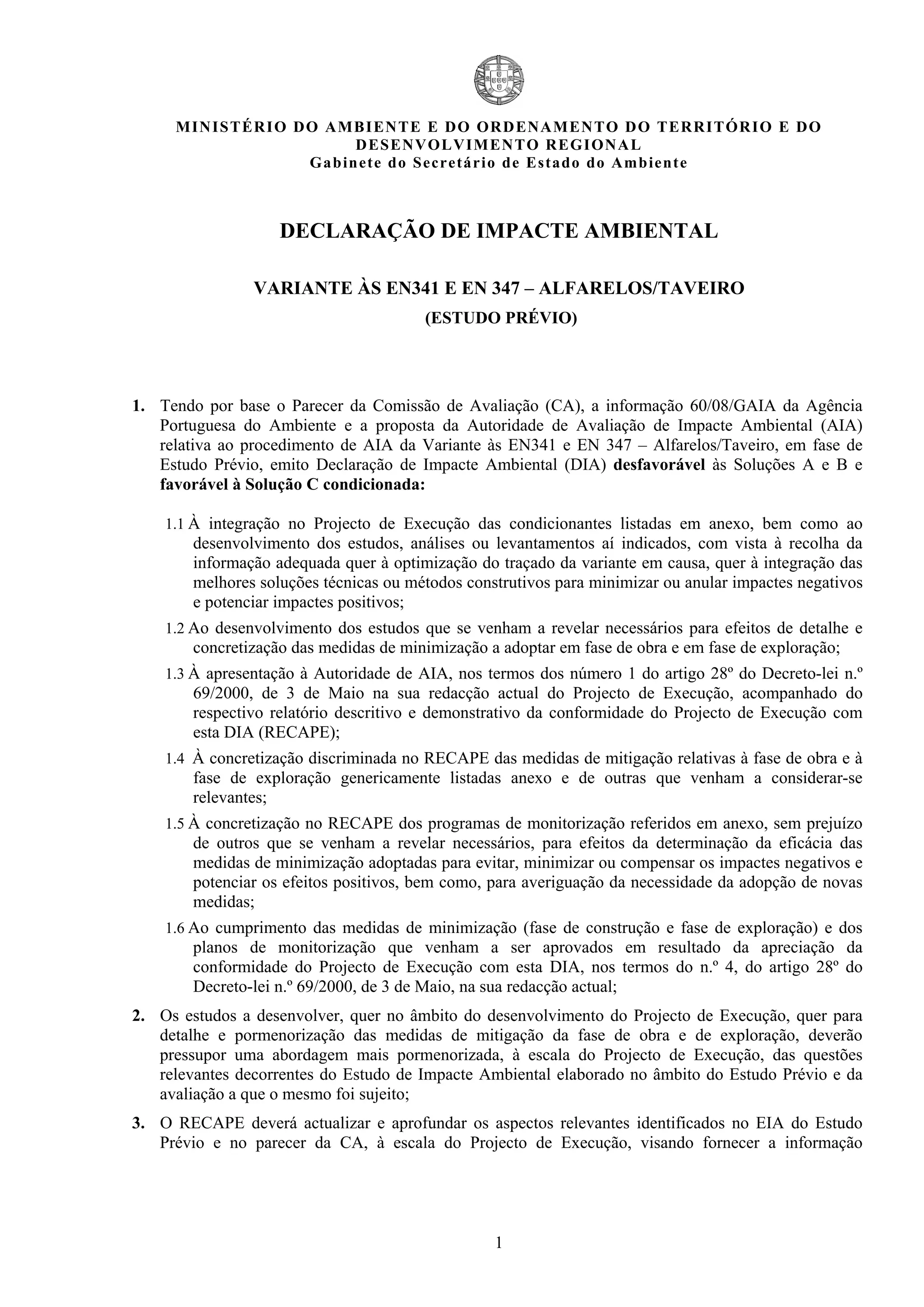Este documento apresenta uma Declaração de Impacte Ambiental favorável à Solução C para a Variante às EN341 e EN347 - Alfarelos/Taveiro, condicionada a 21 pontos relacionados com a minimização de impactos ambientais no Projecto de Execução, incluindo a integração de corredores ecológicos e medidas de mitigação de ruído.