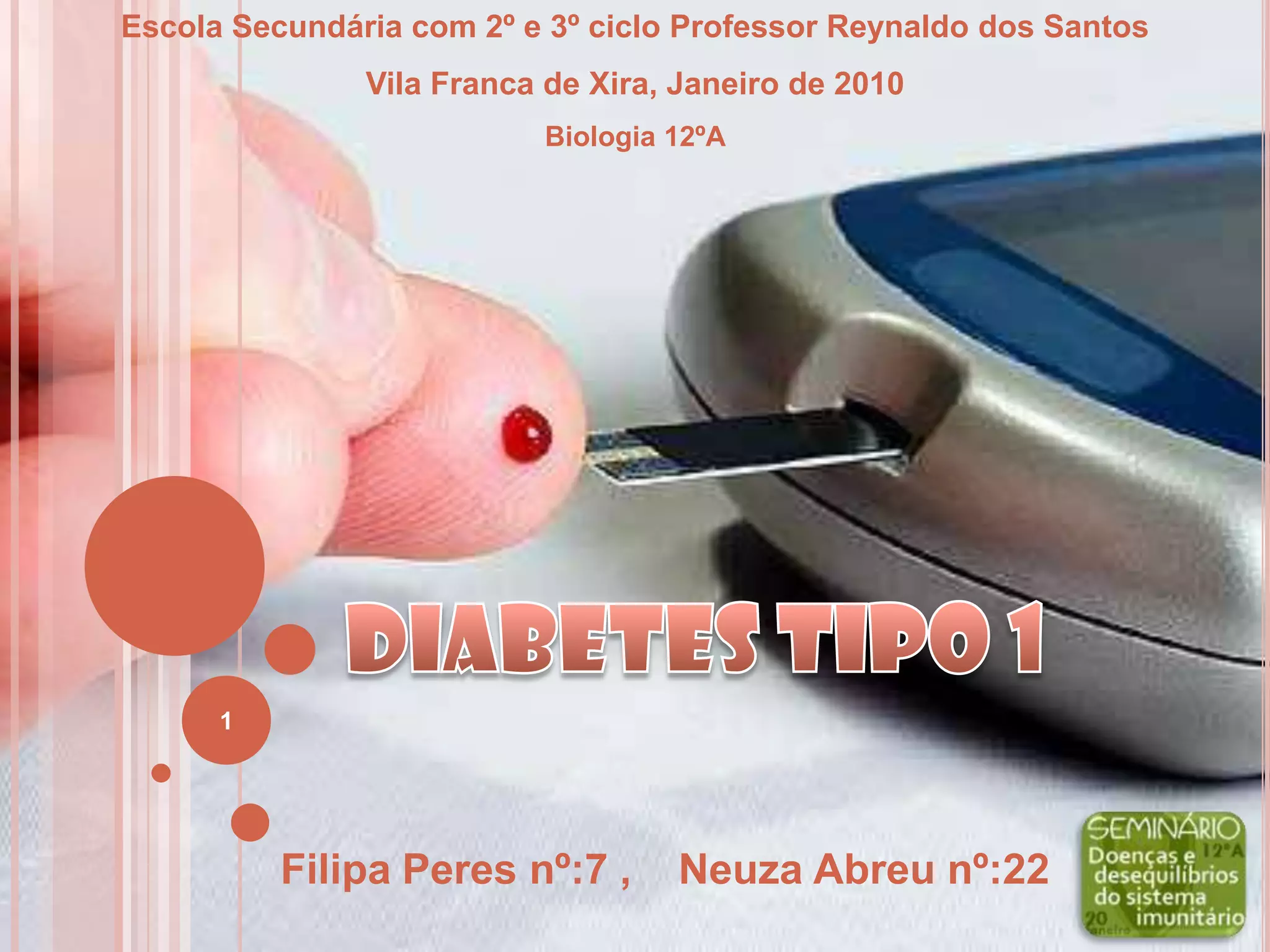 Este documento discute a diabetes tipo 1, incluindo sua definição como uma doença autoimune que requer injeções diárias de insulina. Ele também cobre os sintomas comuns, como o tratamento envolve monitoramento de glicose e administração de insulina, e possíveis complicações. Finalmente, discute outros tipos de diabetes e enfatiza a importância de um estilo de vida saudável.