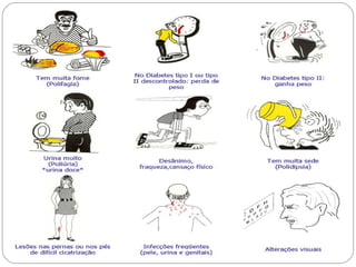 O documento descreve as atividades de um grupo de orientação aos diabéticos de uma Unidade Básica de Saúde, abordando tópicos como: 1) o que é diabetes e como pode se manifestar; 2) a importância da glicose e da insulina no organismo; 3) como medir a glicemia e aplicar a insulina corretamente; 4) possíveis complicações da doença.
