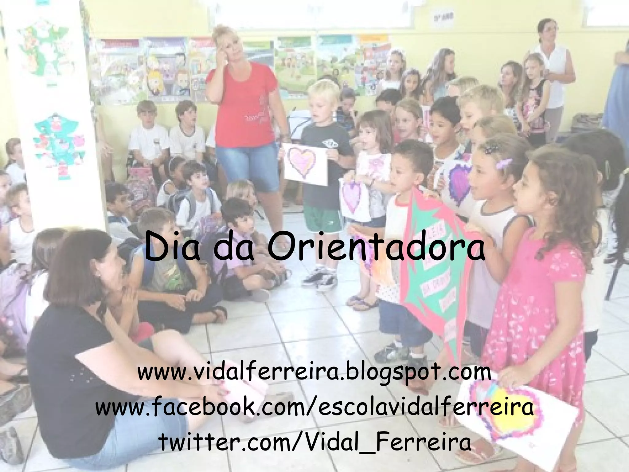 O documento promove o Dia da Orientadora, fornecendo links para o blog, página no Facebook e conta no Twitter da Escola Vidal Ferreira.