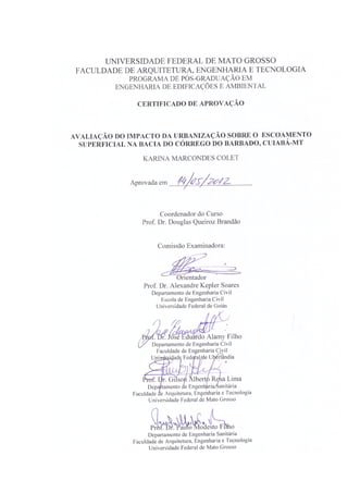 Este documento apresenta uma dissertação de mestrado sobre a avaliação do impacto da urbanização sobre o escoamento superficial na Bacia do Córrego do Barbado em Cuiabá-MT. O trabalho analisa índices de qualidade ambiental, estima o escoamento superficial através de simulações hidrológicas e faz um diagnóstico ambiental da Área de Preservação Permanente do córrego.