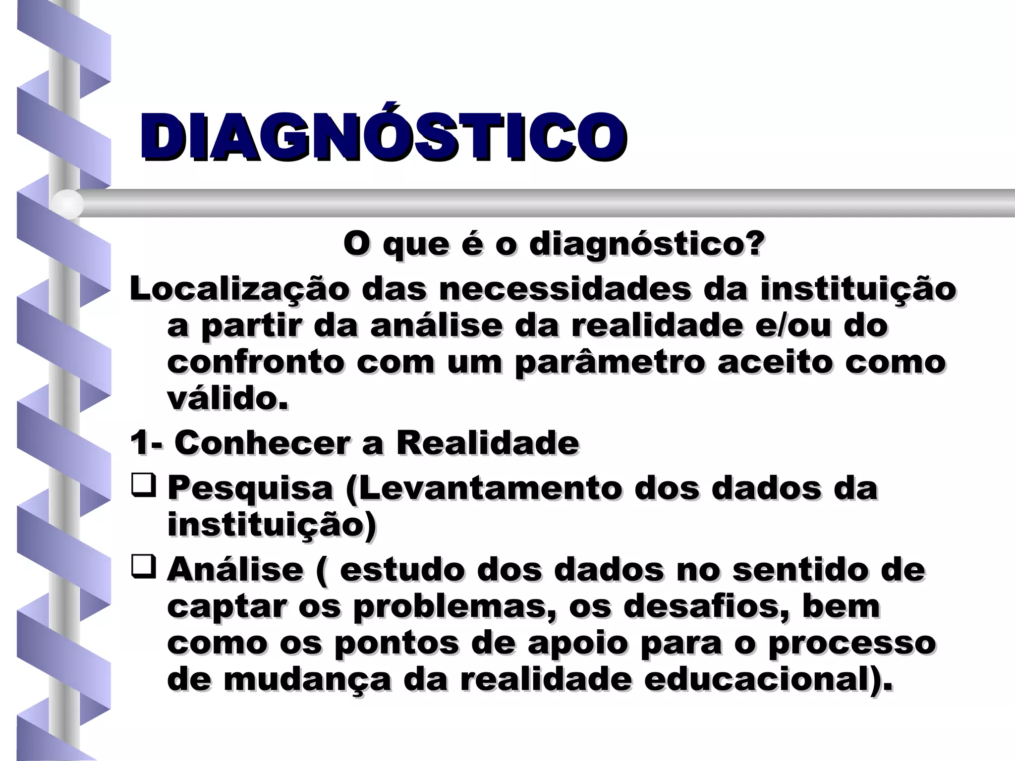 O documento discute o que é diagnóstico educacional e como realizá-lo. 1) Diagnóstico envolve conhecer a realidade através de pesquisa e análise de dados para identificar problemas e desafios; 2) Comparar a realidade a um referencial para julgar discrepâncias; 3) Localizar as necessidades mais urgentes através de um olhar atento às contradições da realidade.
