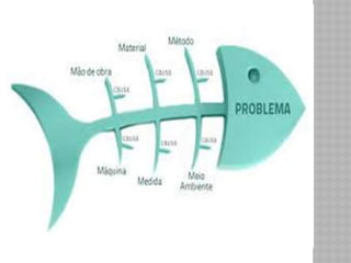 O documento descreve o diagrama de Ishikawa, também conhecido como diagrama de causa e efeito ou diagrama em formato de espinha de peixe. Foi criado por Kaoru Ishikawa em 1943 para identificar as causas que levam a um determinado efeito ou problema, categorizando-as em seis grupos: método, matéria-prima, mão de obra, máquinas, medição e meio ambiente. O diagrama é uma ferramenta amplamente utilizada para melhoria e controle de qualidade.