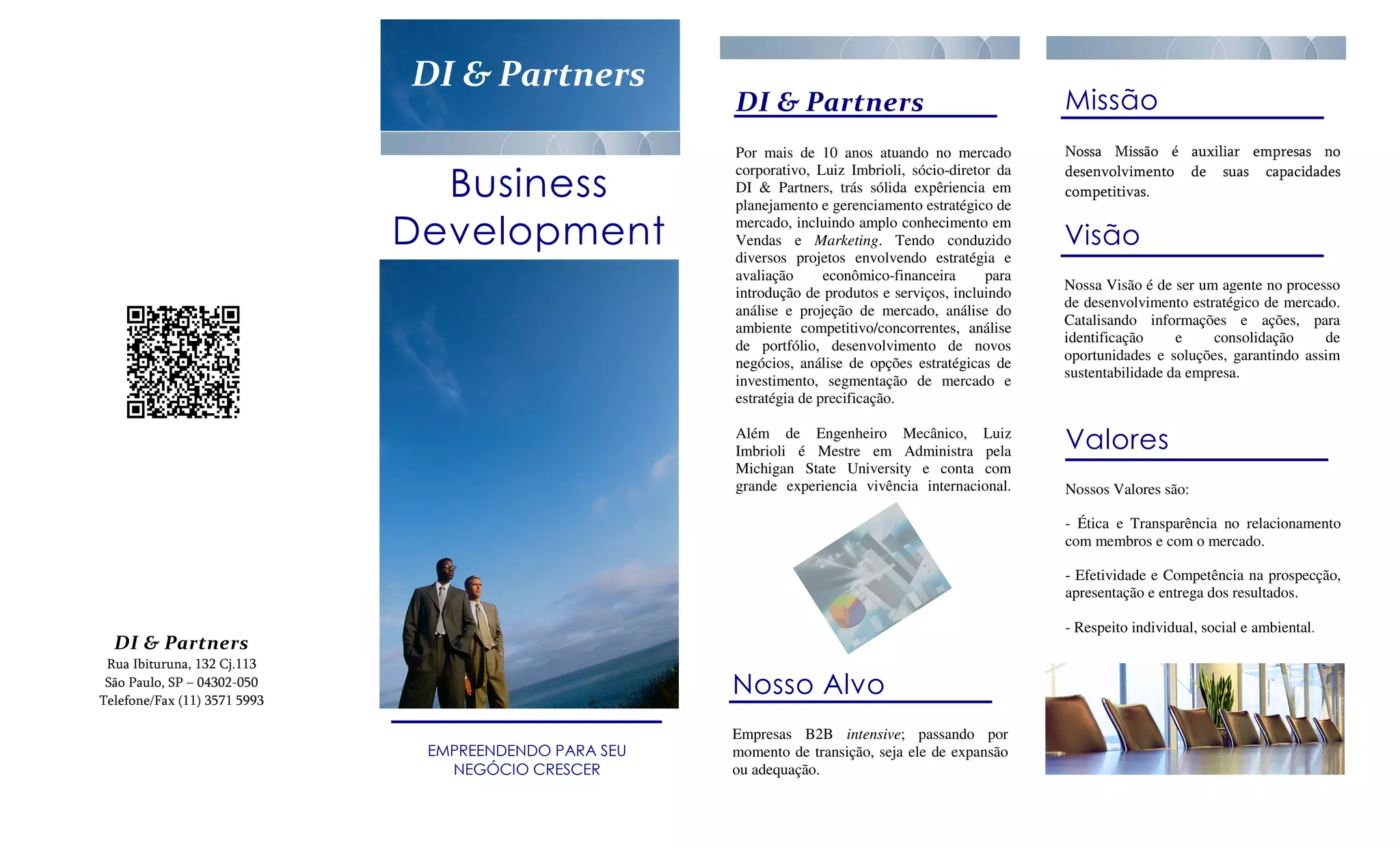 A DI & Partners é uma empresa de consultoria que oferece serviços de planejamento estratégico de vendas, avaliação de posicionamento estratégico, M&A e start-ups, otimização de processos e implementação de sistemas. Sua missão é auxiliar empresas no desenvolvimento de capacidades competitivas de forma ética e competente.