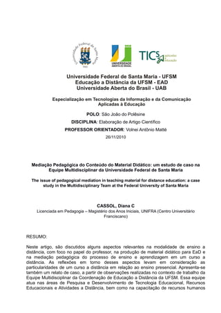 Este documento discute a importância da mediação pedagógica na produção de material didático para educação a distância. Apresenta um estudo de caso sobre o trabalho de uma equipe multidisciplinar de uma universidade que produz material para cursos a distância. Argumenta-se que a elaboração de material didático para educação a distância requer uma abordagem diferente da educação presencial e que equipes multidisciplinares são essenciais nesse processo.