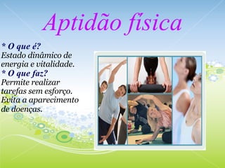 O documento discute a relação entre aptidão física, saúde e meio ambiente. A aptidão física promove a saúde ao permitir realizar tarefas sem esforço e evitar doenças, enquanto a saúde depende de fatores como alimentação, saneamento e aptidão física. O meio ambiente saudável é necessário para a saúde humana, mas danos ambientais prejudicam a saúde e causam doenças. Aptidão física, saúde e meio ambiente estão interligados