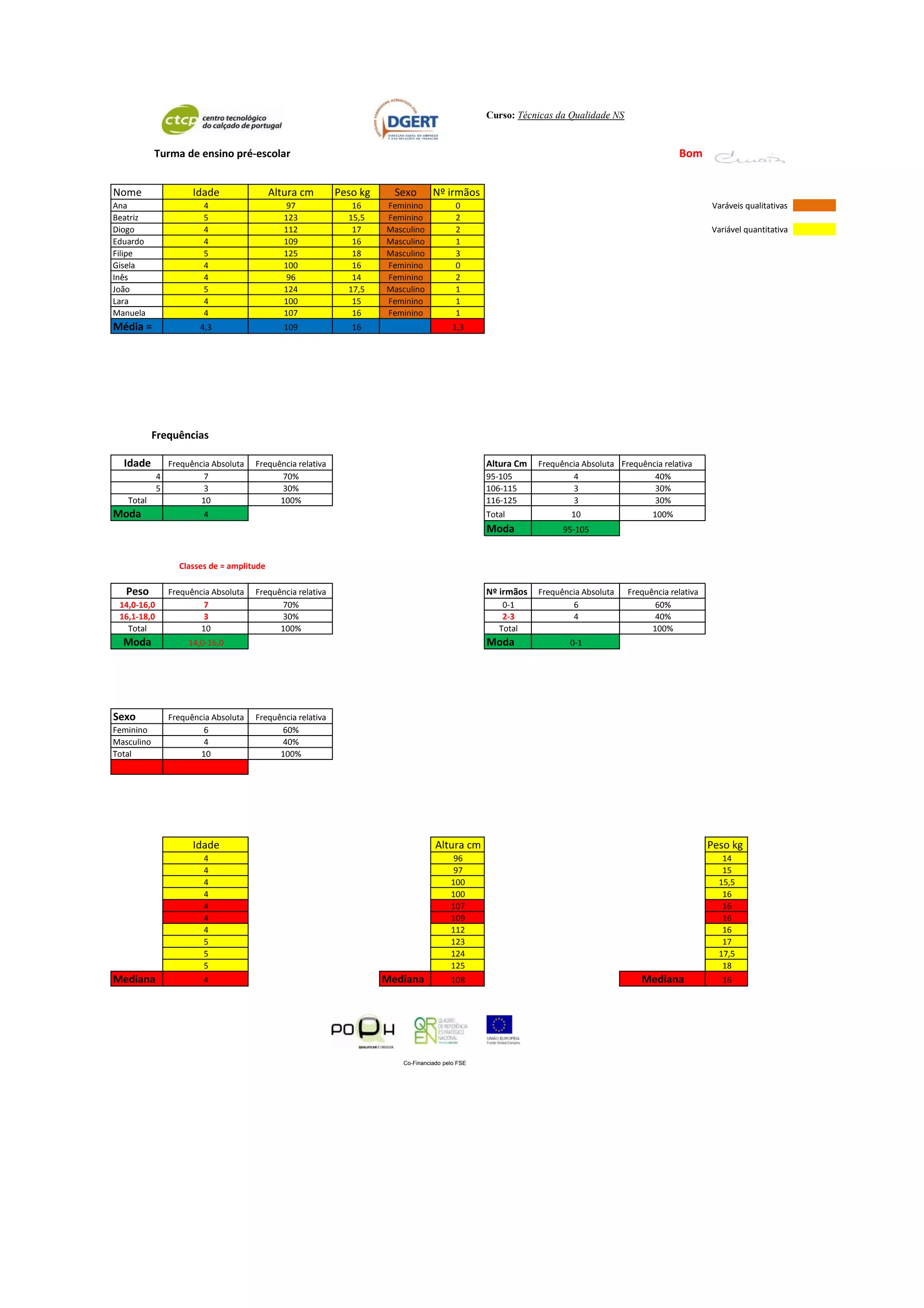 O documento apresenta dados estatísticos sobre 10 crianças de uma turma de ensino pré-escolar, incluindo idade, altura, peso, sexo e número de irmãos. A maioria das crianças tem 4 anos de idade, entre 95-105 cm de altura e pesam entre 14-16 kg. A maioria também não tem irmãos ou tem entre 1-2 irmãos.