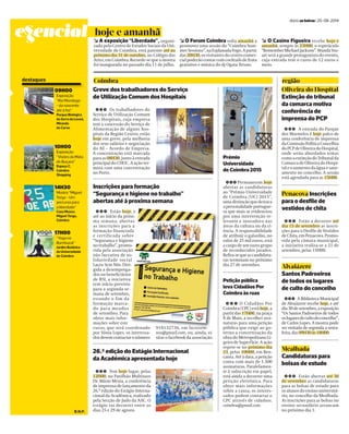 Greve dos trabalhadores do Serviço de Utilização Comum dos Hospitais. Inscrições para formação sobre "Segurança e higiene no trabalho" abertas até à próxima semana. Colisão entre autocarro e pesado causa cinco feridos no IP3 entre Penacova e Espinheira.