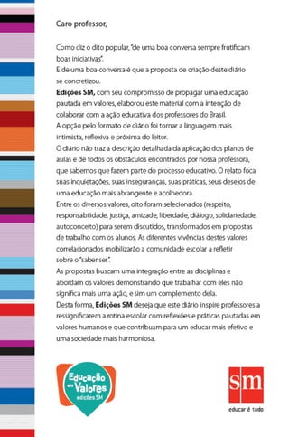 1) Uma professora recebe um diário de presente e decide usá-lo para refletir sobre como melhorar sua prática docente e trabalhar valores com seus alunos.