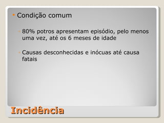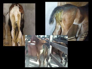 Este documento discute a diarreia em potros, incluindo fatores de risco, agentes causais, classificação e abordagens de diagnóstico e tratamento. A diarreia é comum em potros e pode ter causas variadas, desde virais e parasitárias até problemas nutricionais ou de manejo. O documento descreve cinco tipos de diarreia com base nos danos causados à mucosa intestinal e suas implicações clínicas. O diagnóstico envolve a análise de sintomas, exames laboratoriais e culturas para identificar