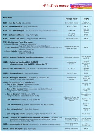Este documento apresenta o programa de atividades para a Semana do Agrupamento, incluindo palestras, workshops, torneios desportivos e culturais organizados por professores e alunos das escolas. As atividades decorrerão em vários locais como a ESAG, EACB, CE Riachos e abrangem toda a comunidade educativa com o objetivo de promover a integração entre ciclos e escolas.