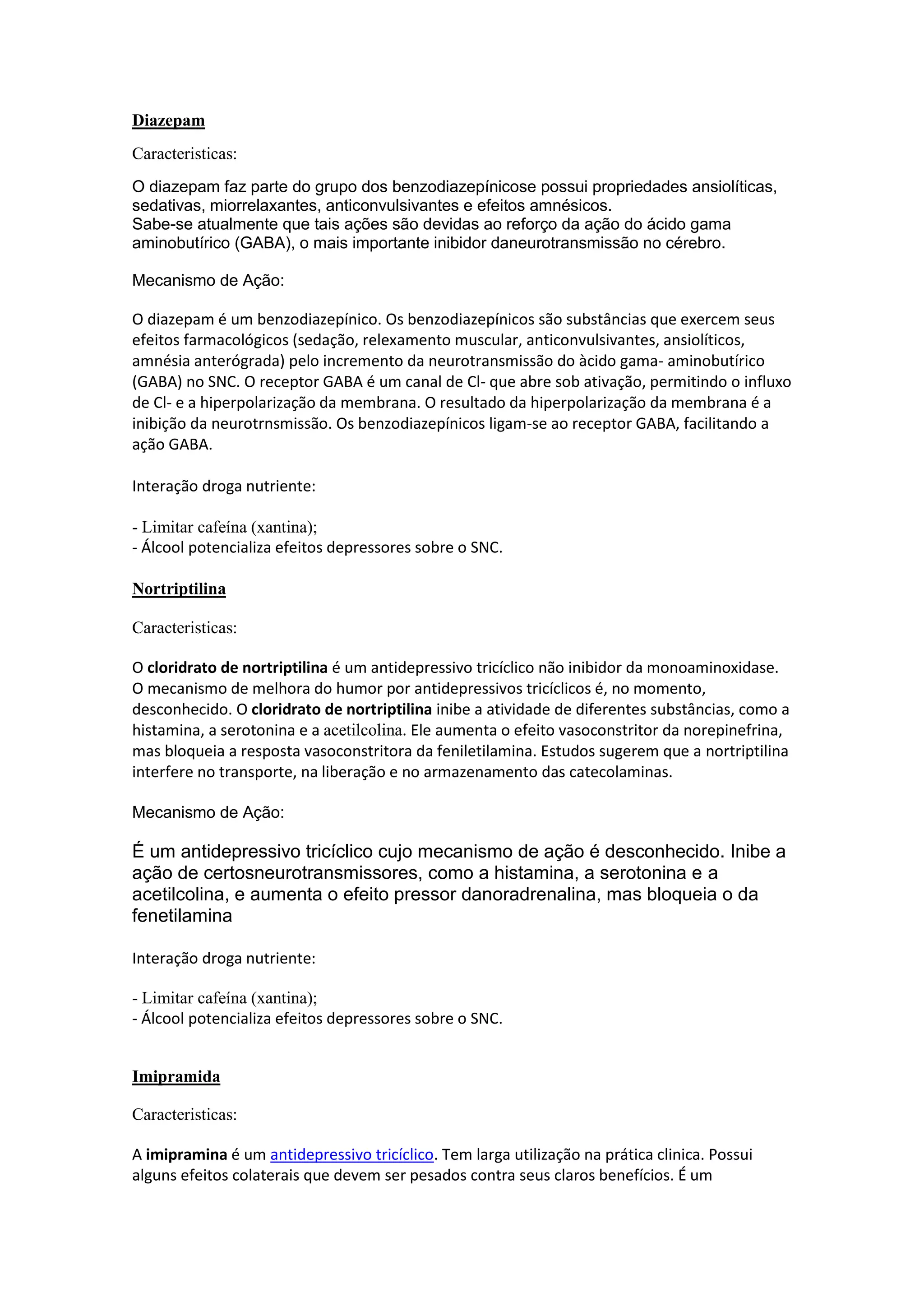 O documento descreve as características e mecanismos de ação de vários medicamentos, incluindo diazepam, nortriptilina, imipramida, ergotamina, pentoxifilina, lorazepam, haloperidol, ranitidina, clomipramida, clorpromazina, metildopa e metformina. Fornece detalhes sobre suas indicações, efeitos farmacológicos, interações e absorção.