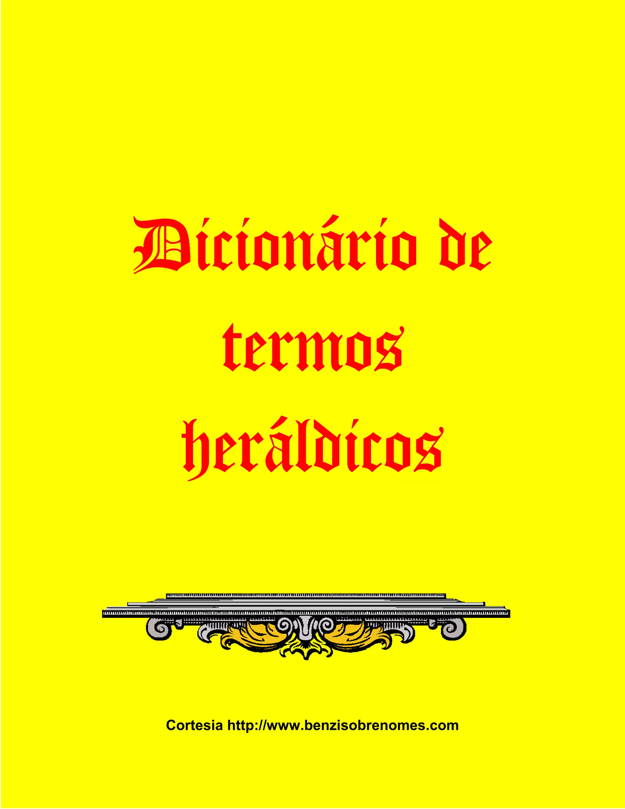 Este dicionário de termos heráldicos fornece definições concisas para diversos elementos e conceitos utilizados em blasonamentos heráldicos, como peças, esmaltes, animais e objetos. As entradas descrevem a forma e posição corretas de representação destes itens para que os blasonamentos sejam precisos. O documento serve como guia para a compreensão dos termos técnicos empregados na heráldica.
