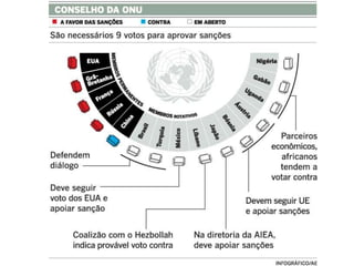 O documento descreve o histórico do programa nuclear do Irã desde a década de 1950, quando iniciou com assistência dos EUA, até o acordo assinado em Genebra em 2015 entre o Irã e os 5 membros permanentes do Conselho de Segurança da ONU mais a Alemanha, que estabeleceu controles rígidos sobre o programa nuclear iraniano em troca do alívio de sanções econômicas.