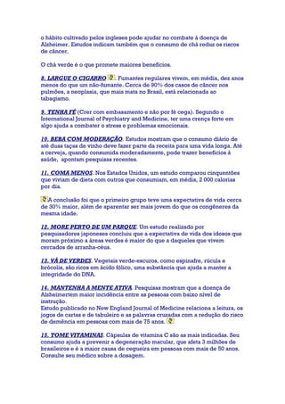 2. Estudos mostram que atividades como casamento, expressão emocional, solidariedade e otimismo estão ligados a maior expectativa de vida, enquanto fumar, beber demais e sedentarismo reduzem a longevidade.