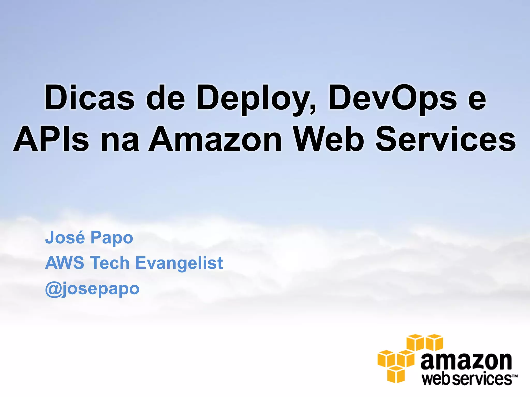 Este documento fornece dicas sobre deploy, DevOps e APIs na Amazon Web Services. Ele discute tópicos como capacidade ajustável e elasticidade automática na nuvem, pagamento apenas pelo uso, infraestrutura self-service, APIs e automação, e como a nuvem permite escalabilidade automática e inovação. Também apresenta casos de uso da Netflix e outros clientes na AWS.