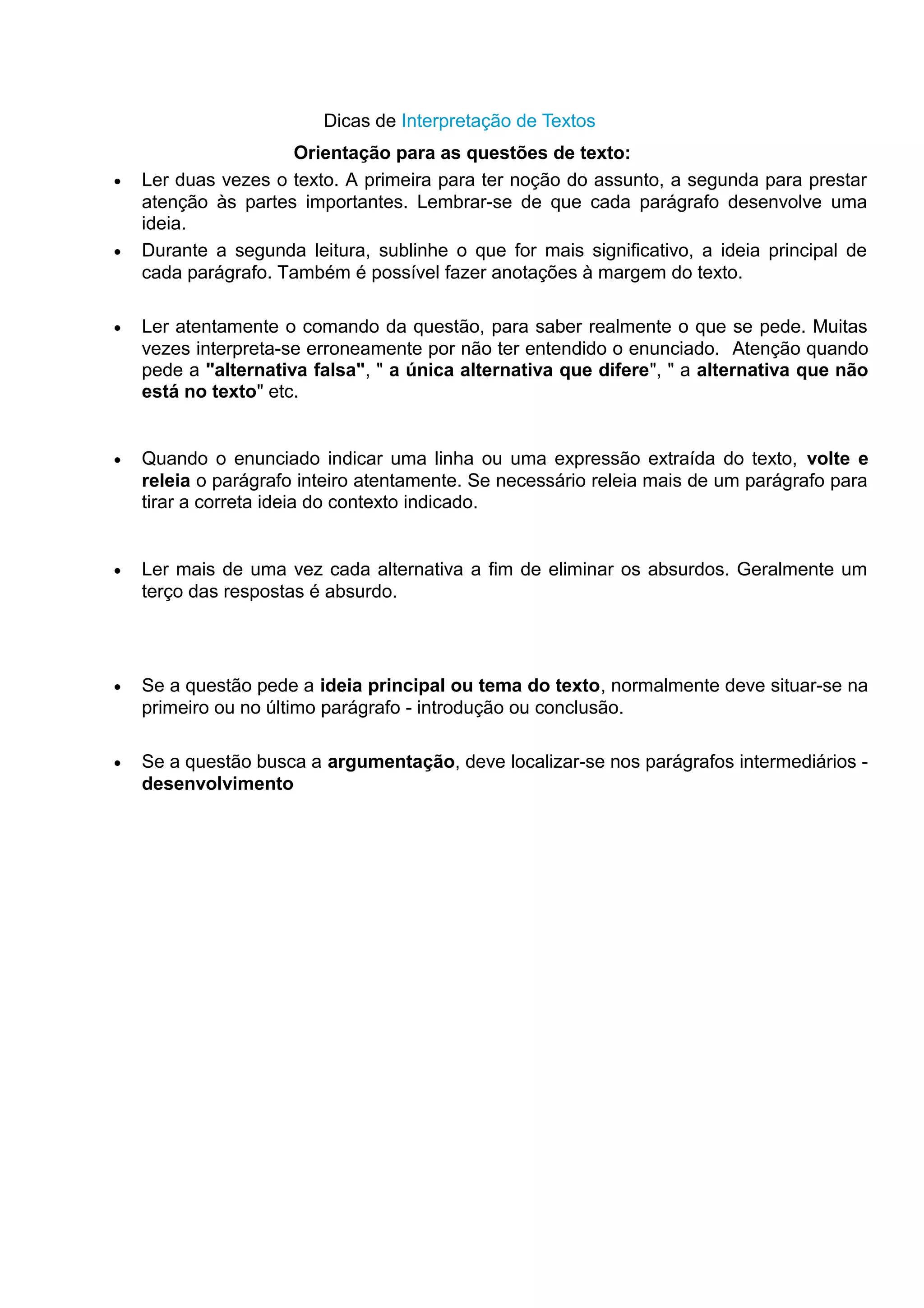 O documento fornece dicas para interpretar textos em questões, como ler o texto duas vezes, sublinhar ideias principais, ler atentamente o enunciado da questão, reler parágrafos para entender contextos, ler alternativas mais de uma vez para eliminar absurdos, e buscar ideias principais na introdução ou conclusão e argumentos nos parágrafos de desenvolvimento.