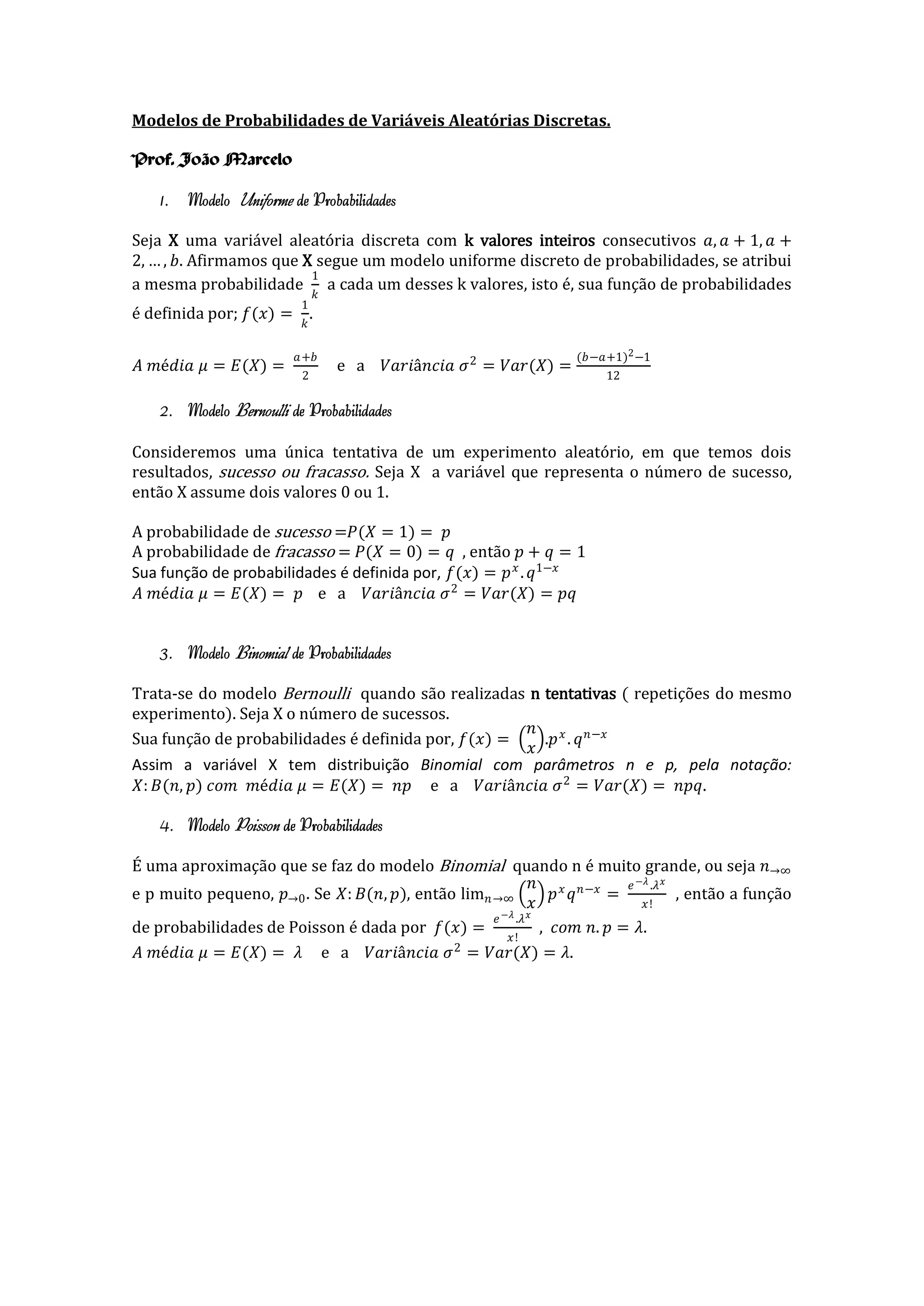 O documento descreve quatro modelos de probabilidades discretas: 1) Modelo uniforme, onde cada valor tem probabilidade igual de 1/k; 2) Modelo de Bernoulli, com probabilidade de sucesso p e fracasso q=1-p; 3) Modelo binomial, generalização de Bernoulli para n tentativas com probabilidade de sucesso p; 4) Modelo de Poisson, aproximação do binomial quando n é grande e p pequeno.