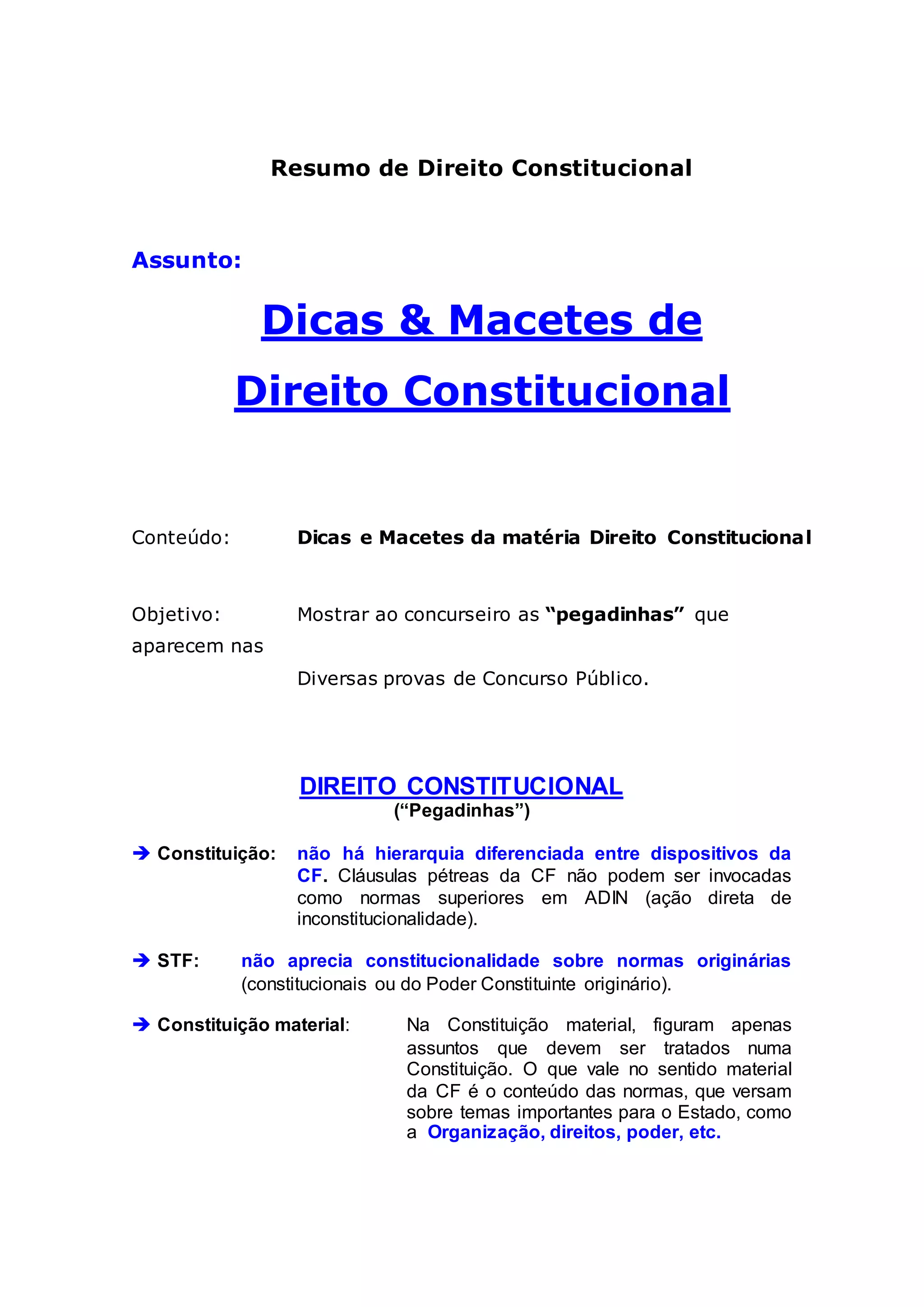 O documento apresenta dicas e macetes sobre Direito Constitucional, com foco nas 'pegadinhas' frequentemente encontradas em provas de concurso público. Ele aborda temas como a hierarquia das normas, tipos de constituições, emendas, controle de constitucionalidade e os direitos individuais e fundamentais. O conteúdo visa auxiliar concurseiros a compreender melhor os aspectos essenciais do Direito Constitucional brasileiro.
