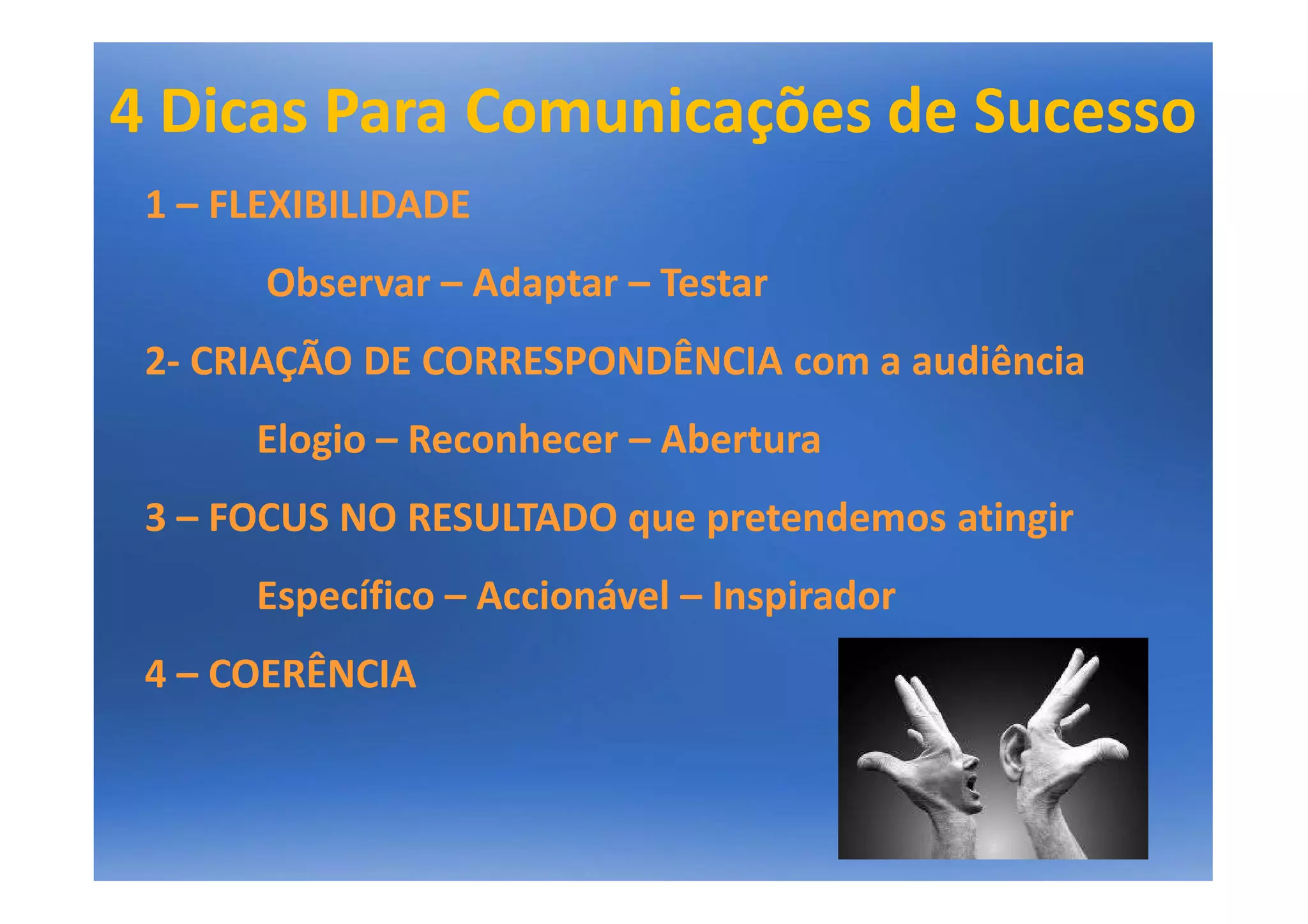 Flexibilidade, correspondência com a audiência, foco no resultado pretendido e coerência são 4 dicas para comunicações de sucesso: observe e adapte-se à audiência, elogie-a e reconheça-a, seja específico sobre o resultado inspirador que se quer alcançar, e mantenha a coerência na mensagem.
