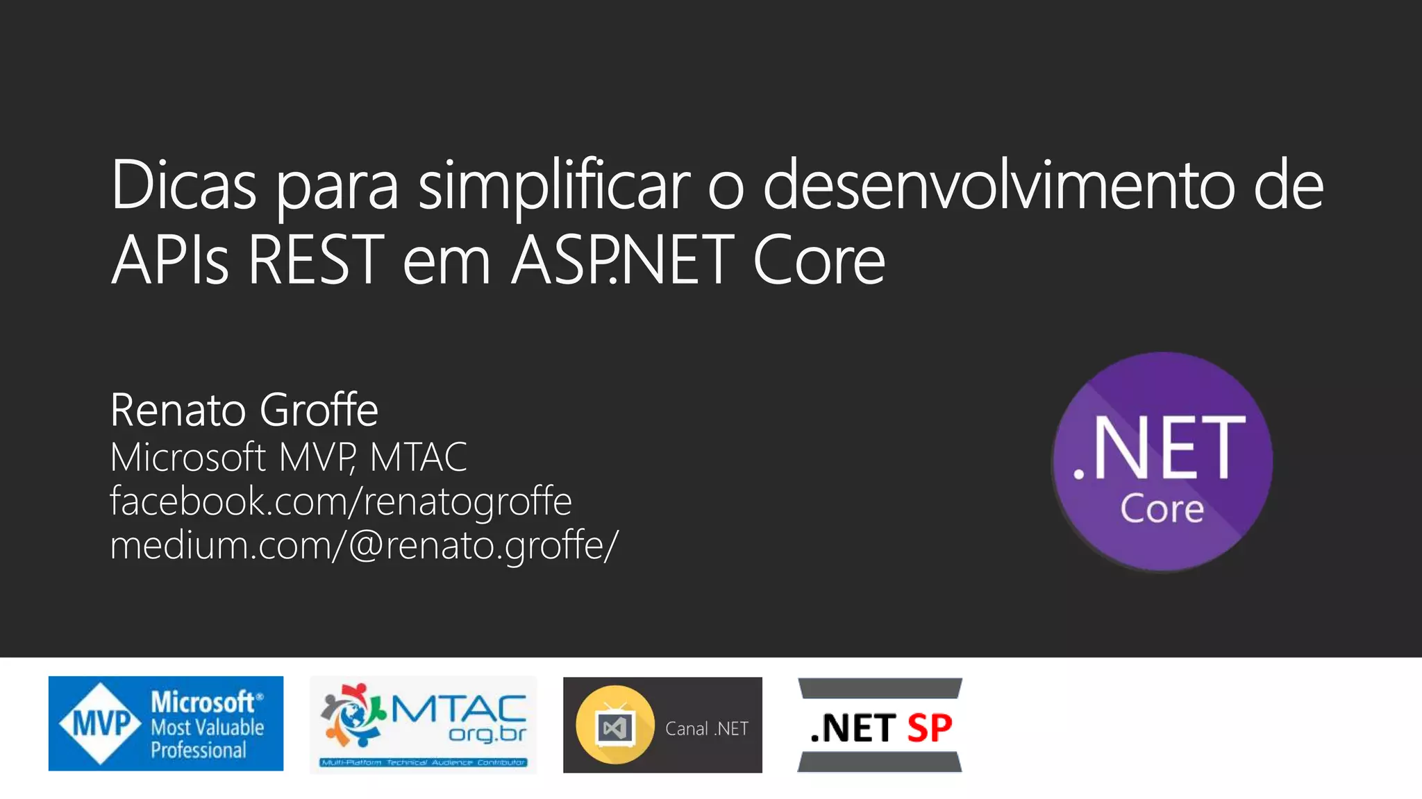 Renato Groffe é um especialista em tecnologia .NET com mais de 15 anos de experiência. Ele fornece dicas e exemplos práticos sobre desenvolvimento .NET Core, incluindo recursos como Health Checks, API Conventions, HTTP REPL e consumo de APIs com Refit. Groffe também é um palestrante e organizador de eventos sobre .NET.