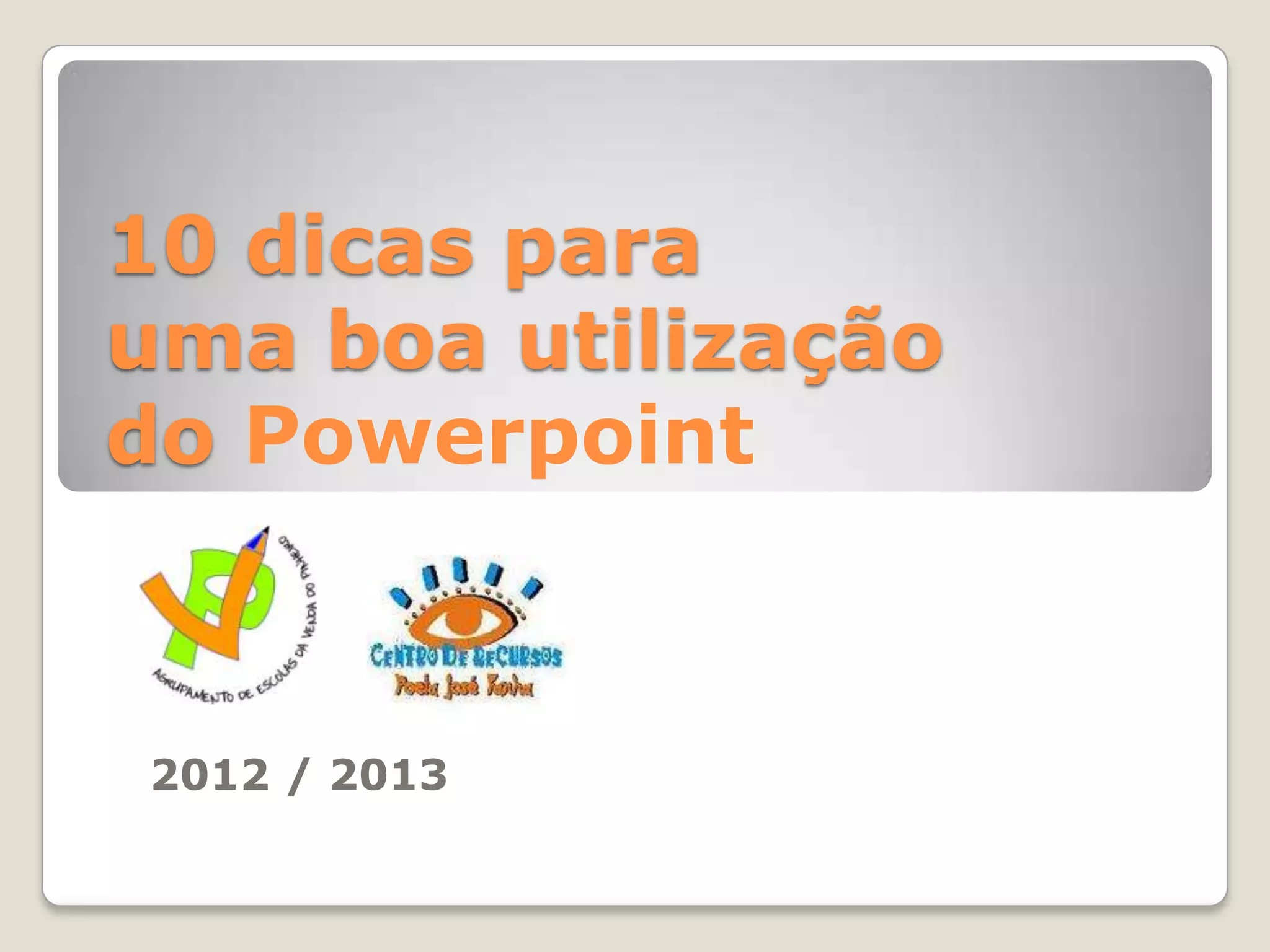 O documento fornece 10 dicas para uma boa utilização do PowerPoint: 1) usar o PowerPoint para preparar uma apresentação oral, mas o discurso deve ser mais forte; 2) reduzir o número de diapositivos ao essencial; 3) usar imagens, gráficos e vídeos curtos para diversidade e apelo visual, evitando animações com texto.