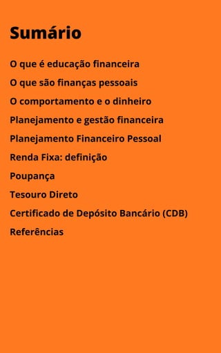 O documento fornece uma introdução sobre educação financeira pessoal, definindo seus principais conceitos como finanças pessoais, planejamento financeiro e tipos de investimentos de renda fixa como poupança, Tesouro Direto e CDB, explicando suas vantagens e desvantagens.