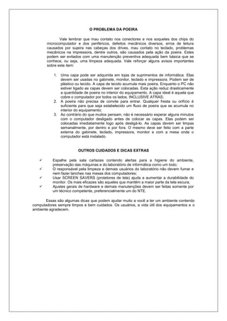 O documento fornece dicas para limpar e manter um laboratório de informática, incluindo limpar os computadores externamente com produtos adequados sem danificar os componentes, usar capas para proteger os equipamentos da poeira, e manter o ambiente limpo e livre de poeira.